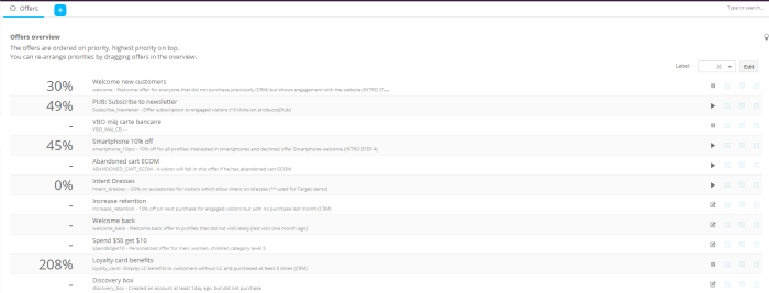 The 'Edit' button in the upper right corner makes the 'Offers' overview editable. It allows changing the order in which the offers appear. Offers can be moved around through drag and drop. The position of the offer in the list determines the order in which these offers are executed (priority).