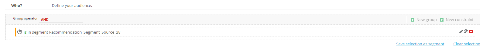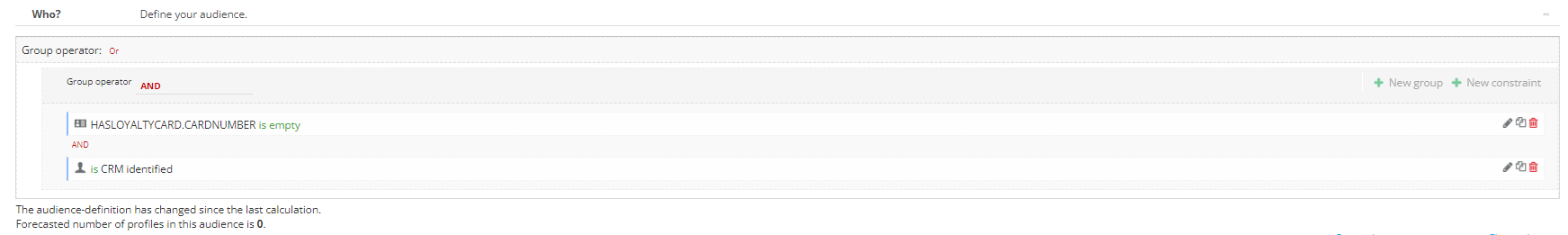 Define your offer audience using the constraint editor. Link constraints using the operators And, Or, AndNot, OrNot. Create groups to group conditions together. When no audience is defined, the offer is triggered for every profile.