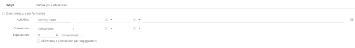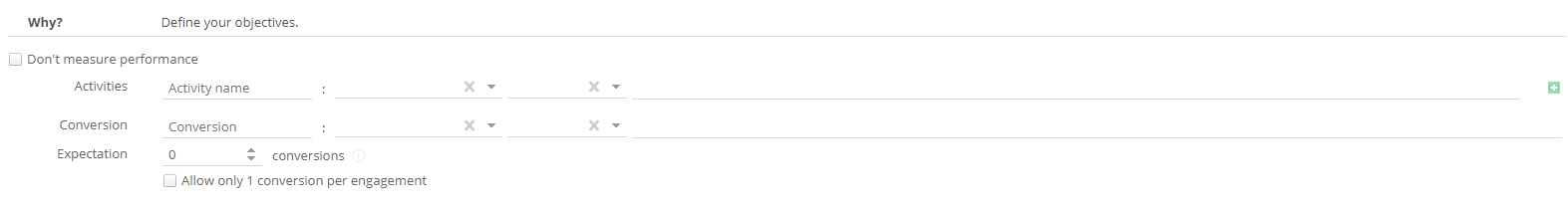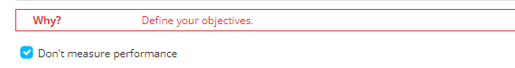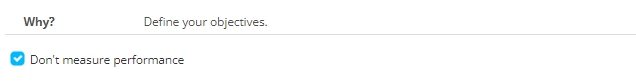 In the Why? section, the option 'don't measure performance' is by default not selected. In this first step, we will check it and not worry about any conversions.