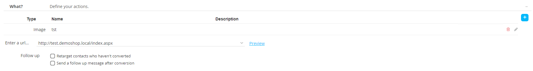 Actions are the content of your offer. In the universe settings, placements were defined. Here we setup what should be displayed in these placements, the offer content that should be displayed in the image banners, pop-ups, pop-ins or other html content elements.