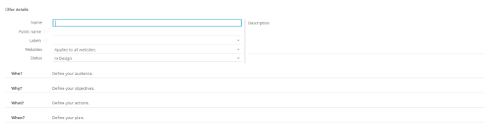 • Name & description— Give a name and good description to identify the offer. Use something meaningful to this offer. Limited to 50 characters maximum, this name is presented in the Offers Overview.
