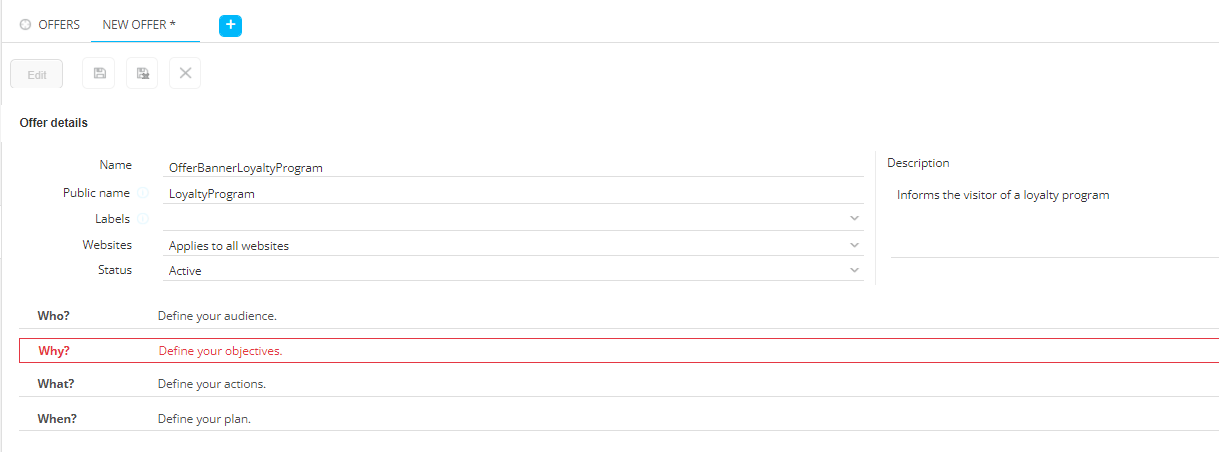 To create a new offer, press . A new tab is added and the following configuration page allows defining the offer: