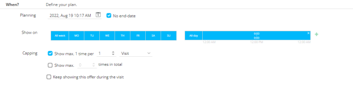 Planning: indicate when the offer should be visible. A calendar is available to choose a start and end date. An end date is not required. In that case the offer is planned infinitely.