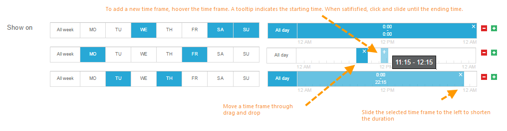 Show on: select the days on the left and time frames on the right. By default the complete time frame is selected. Drag and drop the right border of the selected time frame to the left to make it shorter. To add an additional time frame for the same selection of days, hoover over the time frame and select the area.