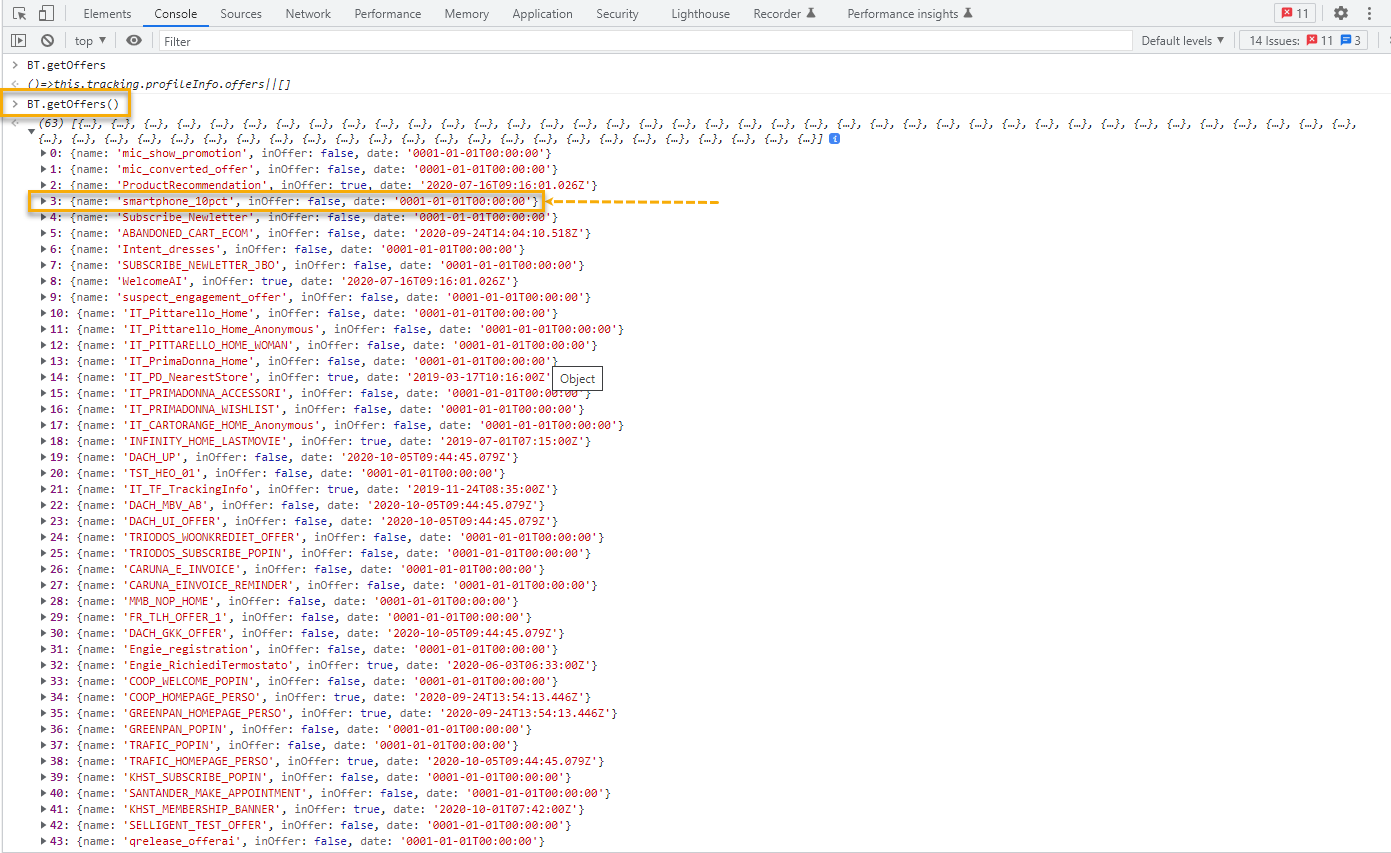 Go to the browser console and type BT.Getoffers().