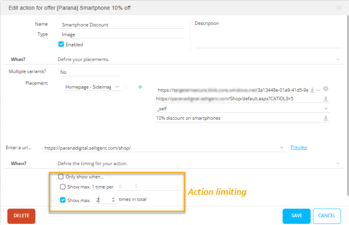 In this case, the action 'Smartphone discount' can only be shown twice at the most. When this limit is reached, the action is no longer triggered.