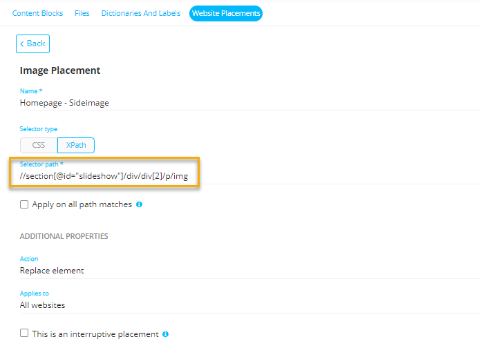 You can retrieve the xpath of the placement in the properties of the placement in the Library chapter.![]()