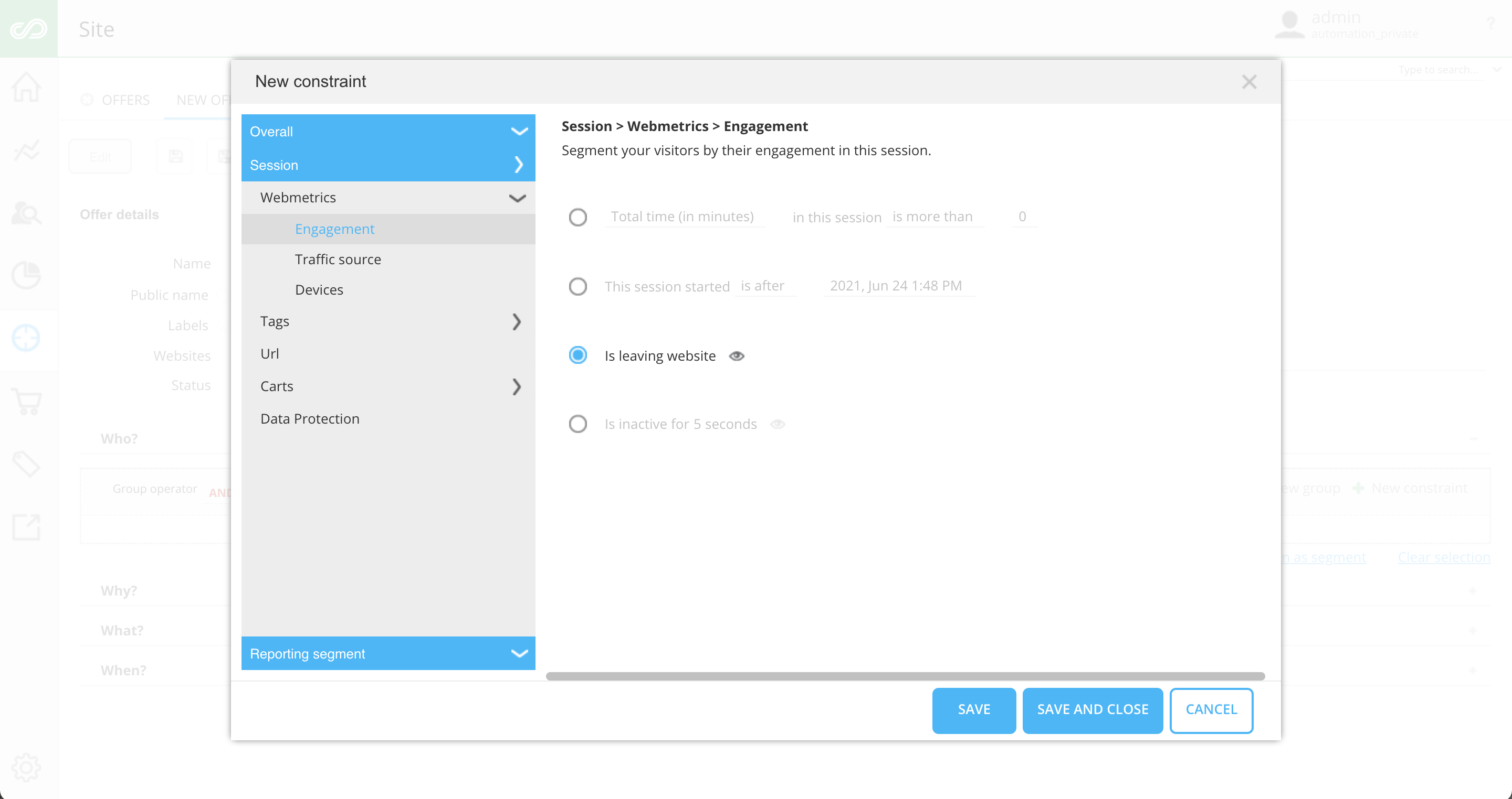 Each action done by a consentless visitor will be considered as a new anonymous hit. Site can target consentless visitors, so marketers can still display offers to all visitors regardless of their preferences - but the range of offer criteria (denoted with the eye symbol) will be limited for consentless visitors.