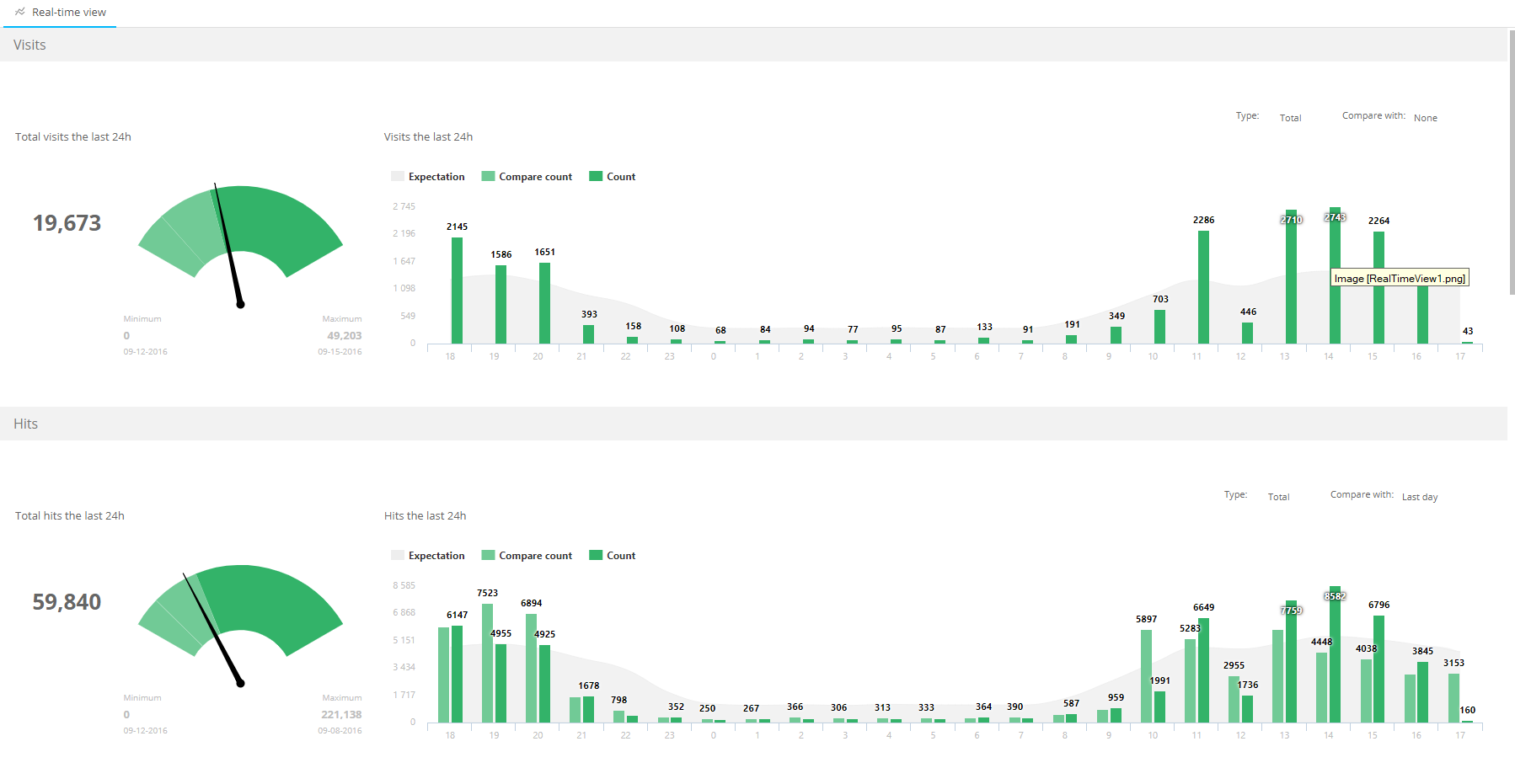 Numbers of the last 24hours can be compared with numbers of the previous day, last week, last month, etc. Use the field 'Compare with' in the upper right corner.
