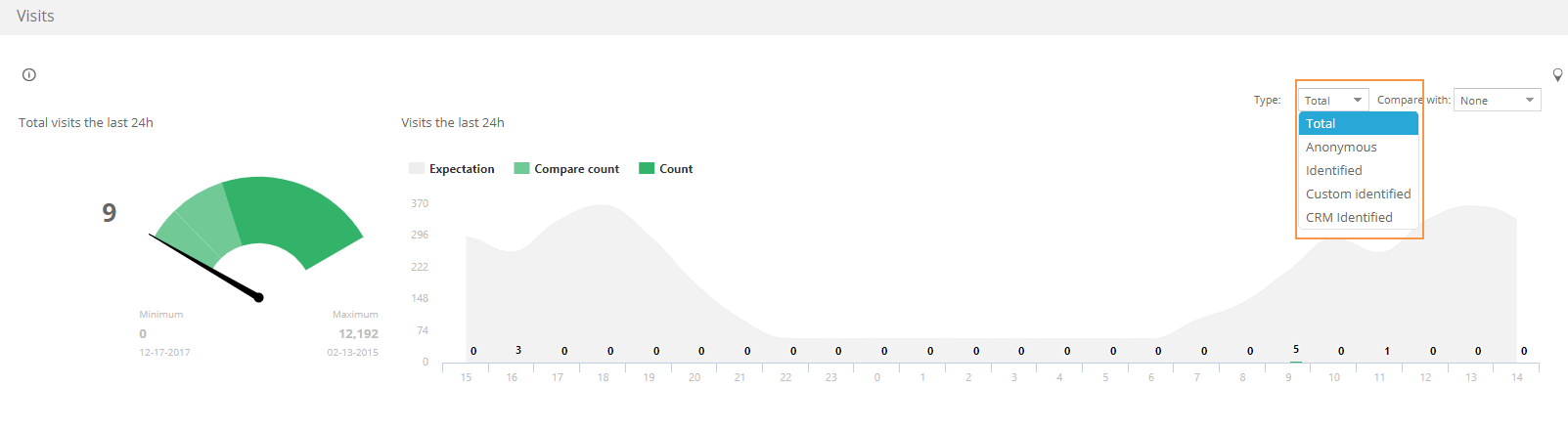 In the upper right corner of the graph, a 'Type' fields filters the information by anonymous, identified, custom identified or CRM identified