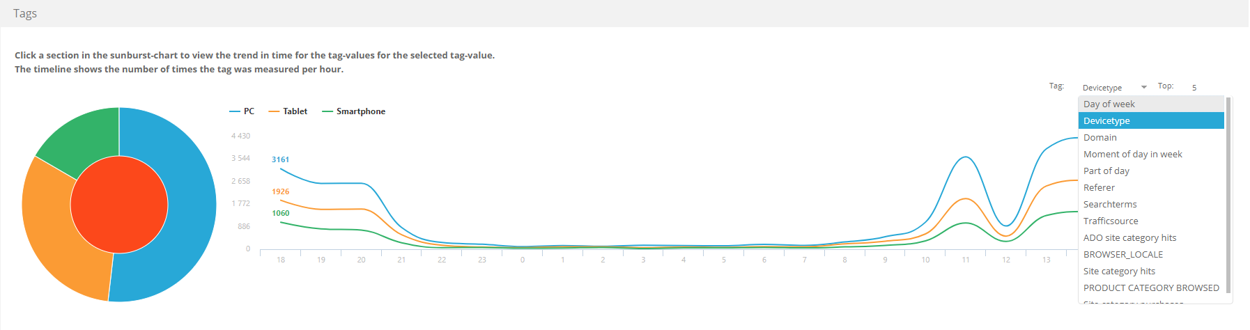 For hierarchical tags, select a level from the multi-level pie graph. It displays the values for that level. (e.g. For a tag “Site category” the MAINCATEGORY displays “Electro” and “Fashion, while the “Fashion” SUBCATEGORY displays “Fashion_men”, “Fashion_women” and “Fashion_children”)