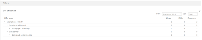 The number of times a specific offer and its actions has been viewed, clicked and led to conversion.