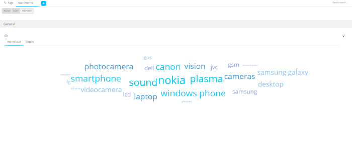 In case of a hierarchical tag a word cloud shows the most used tag values. Click a tag value in the word cloud to display the corresponding reports: