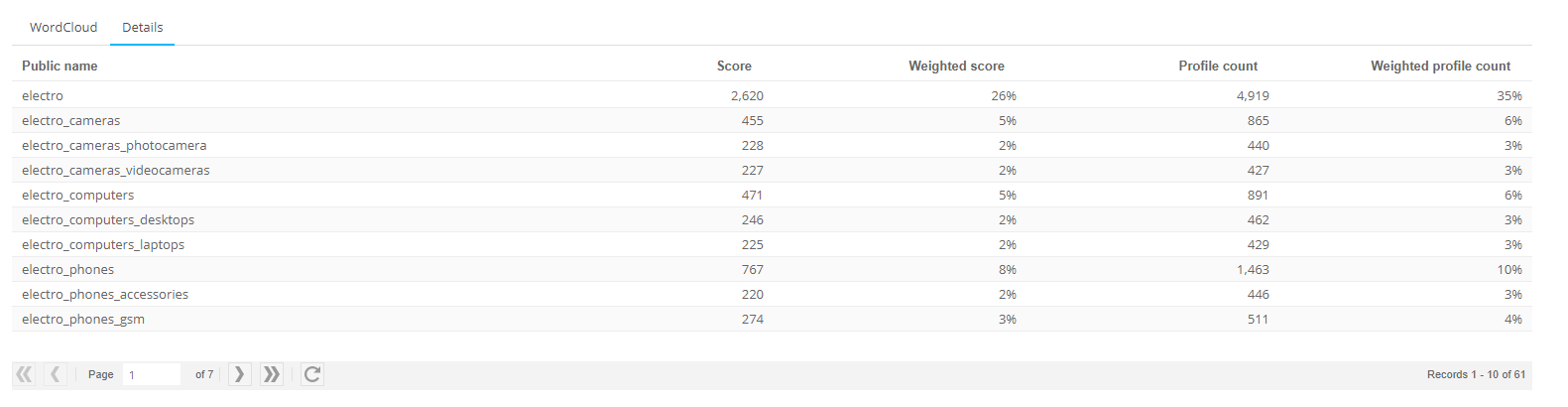 The 'Details' tab provides a table view on scores, profile counts for all tag values.