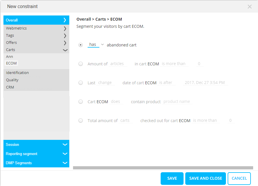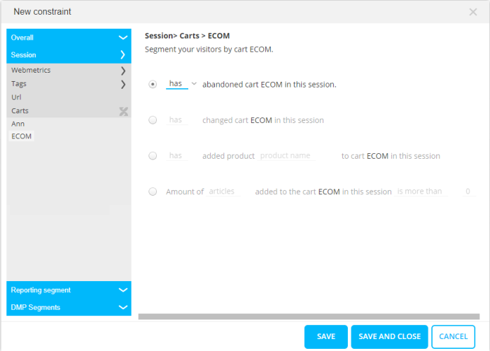 Has the cart been abandoned or not, has the cart been changed or not, has a specific product been added or not to the cart, and finally the number of items/value added is compared to a given value.