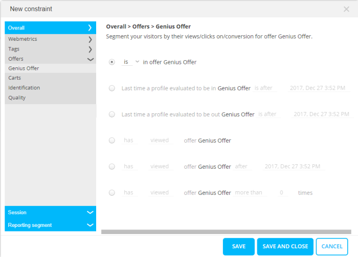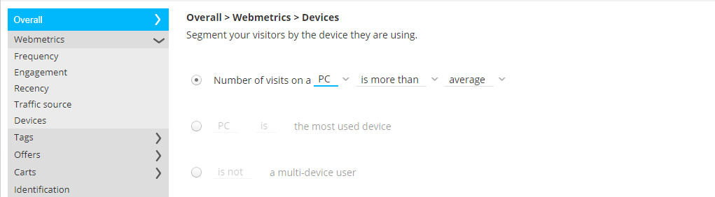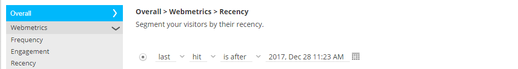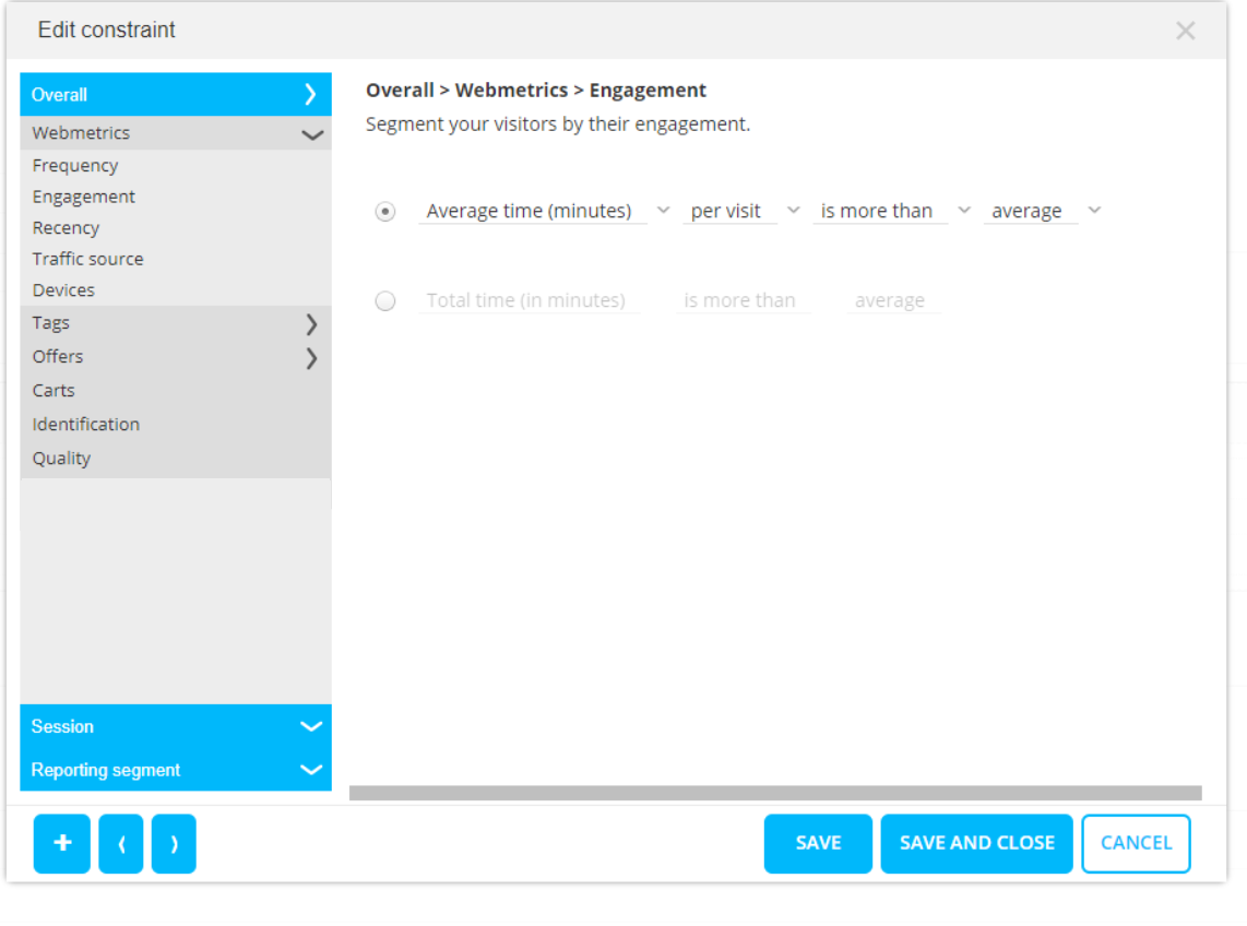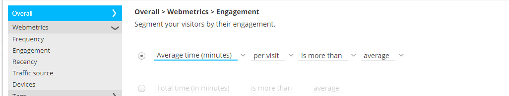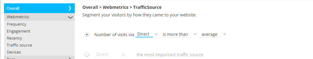The time delay before considered as inactive (only available for offer audiences, not in reporting segments) - Traffic source—From where did the visitor come? possible sources are Direct, Search, Paid search, Social, Affiliate, Email