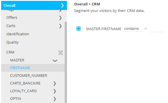 Note: It is possible to test if a CRM field is empty. This allows for instance to target only visitors that do not have profile data yet. A dedicated operator is provided.