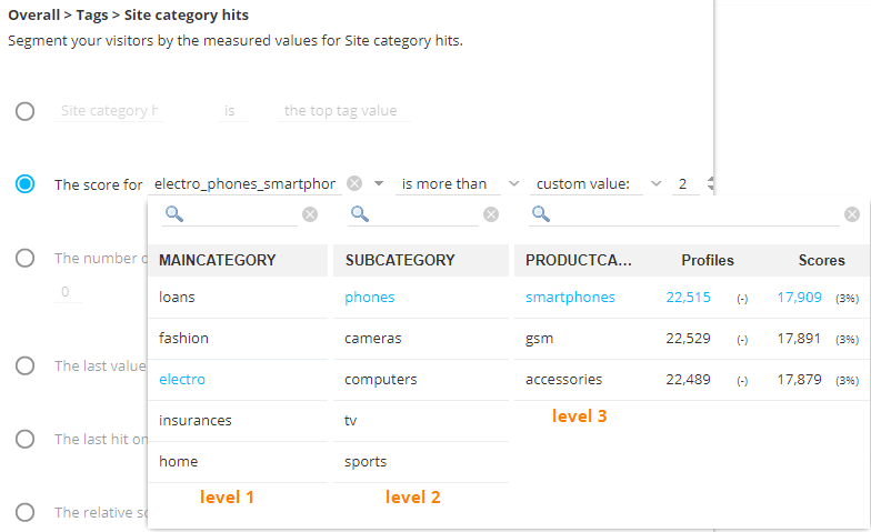 (e.g., the score for 'cameras' is higher than the score for 'smartphones'):