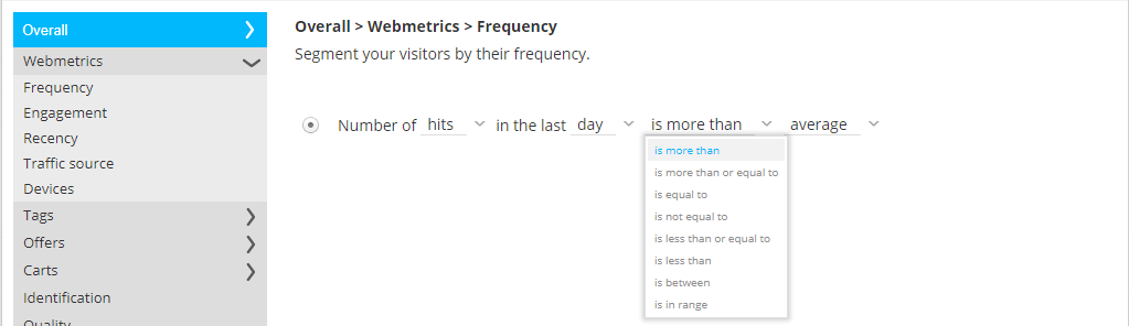 Is the visitor a frequent visitor of the website? The number of hits/visits in the last day/week/month is bigger/smaller/equal than the average or a value, or between two values,or in a range (in which part of the total population).