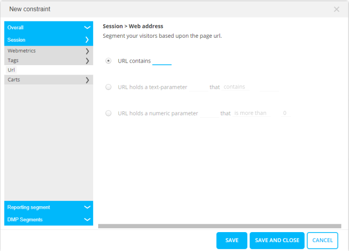 Constraint based on the current website URL, or its parameters or the absence of a URL. The latter will allow to target visitors that are currently NOT on a specific page.
