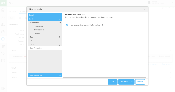 Note 2: If you combine this constraint with other constraints that use tracked or personal data, nothing will be shown. For example, an offer that targets visitors that have not given consent to be tracked and are female will never be displayed because it mixes consentless with identified data.