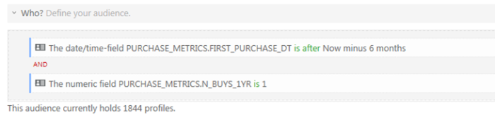 The segment ‘First time buyer’ is based on data coming from a profile extension PURCHASE_METRICS in Selligent. They should have bought once this year, less than six months ago.