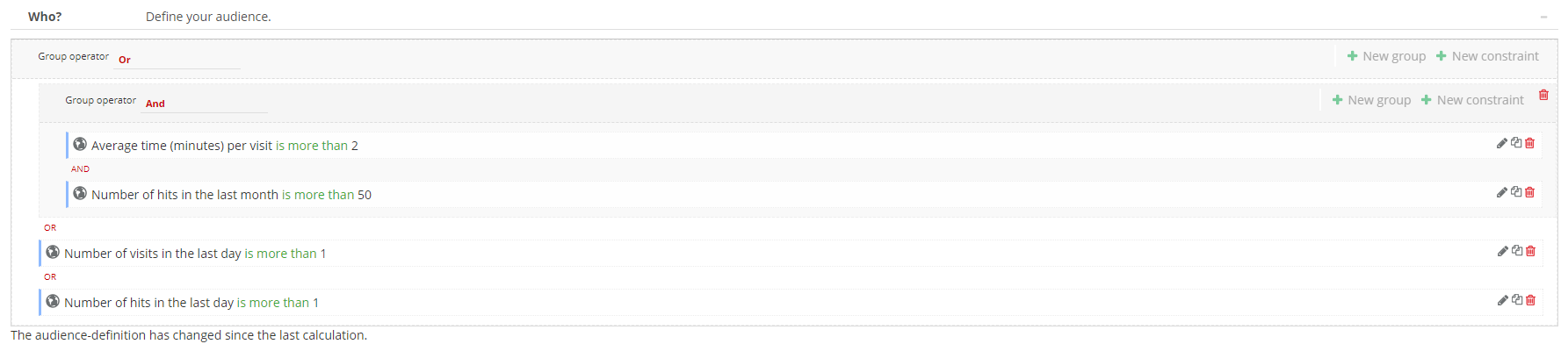 Constraints can be grouped in a single group or in multiple groups with the “And, Or, AndNot, OrNot“ group operators.