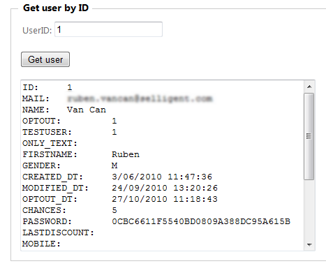 SoapResult = ind.GetUsersByConstraint("147", "MAIL LIKE '%@selligent.com%'", 5, out results, out errorStr);