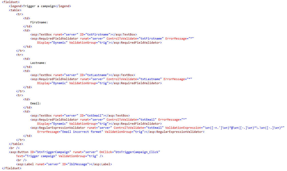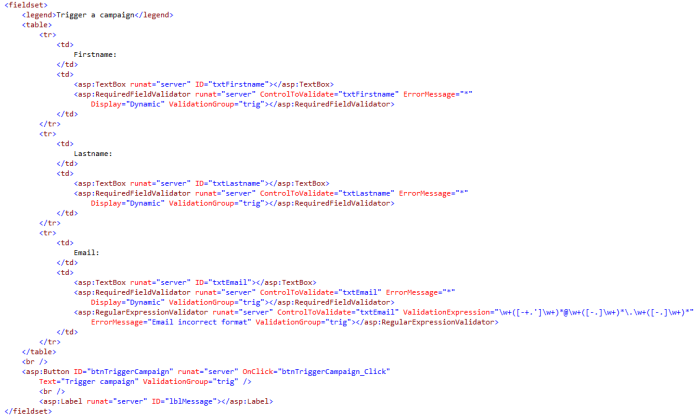 protected void btnTriggerCampaign_Click (object sender, EventArgs e) {