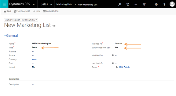 Note: The marketing list will be created as a static segment, linked to the audience list that is defined and configured to be synchronized with Microsoft Dynamics.