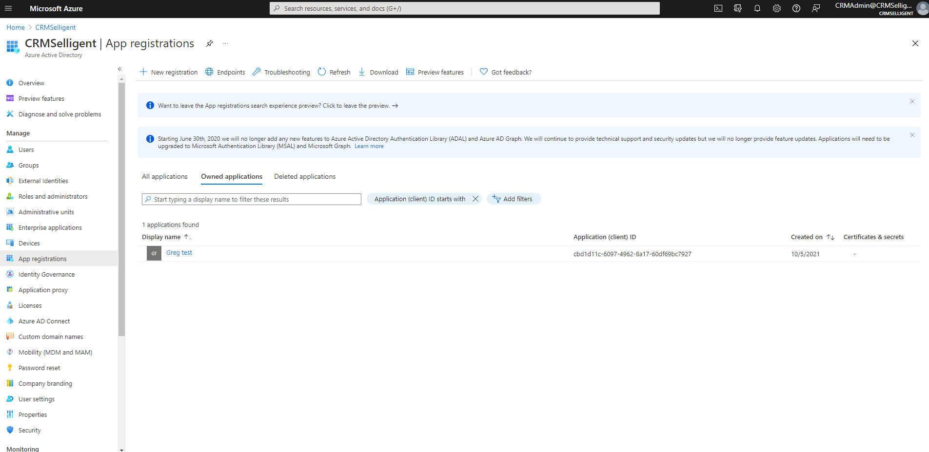 For our test, the user is "CRMAdmin@CRMSelligent.onmicrosoft.com" and the Business unit it belongs to is "CRMSelligent".