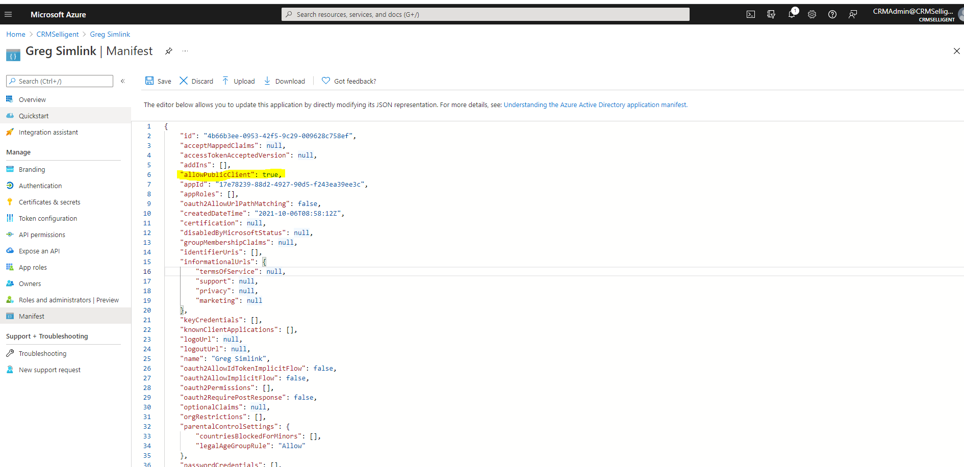 4. When the app is created, go to the Manifest section and set "allowPublicClient": true as shown below.