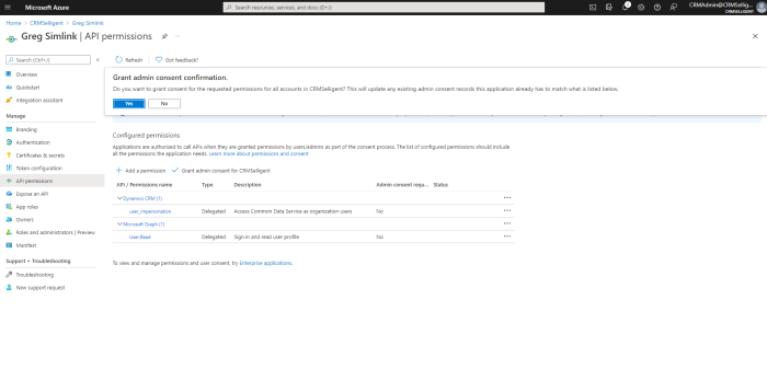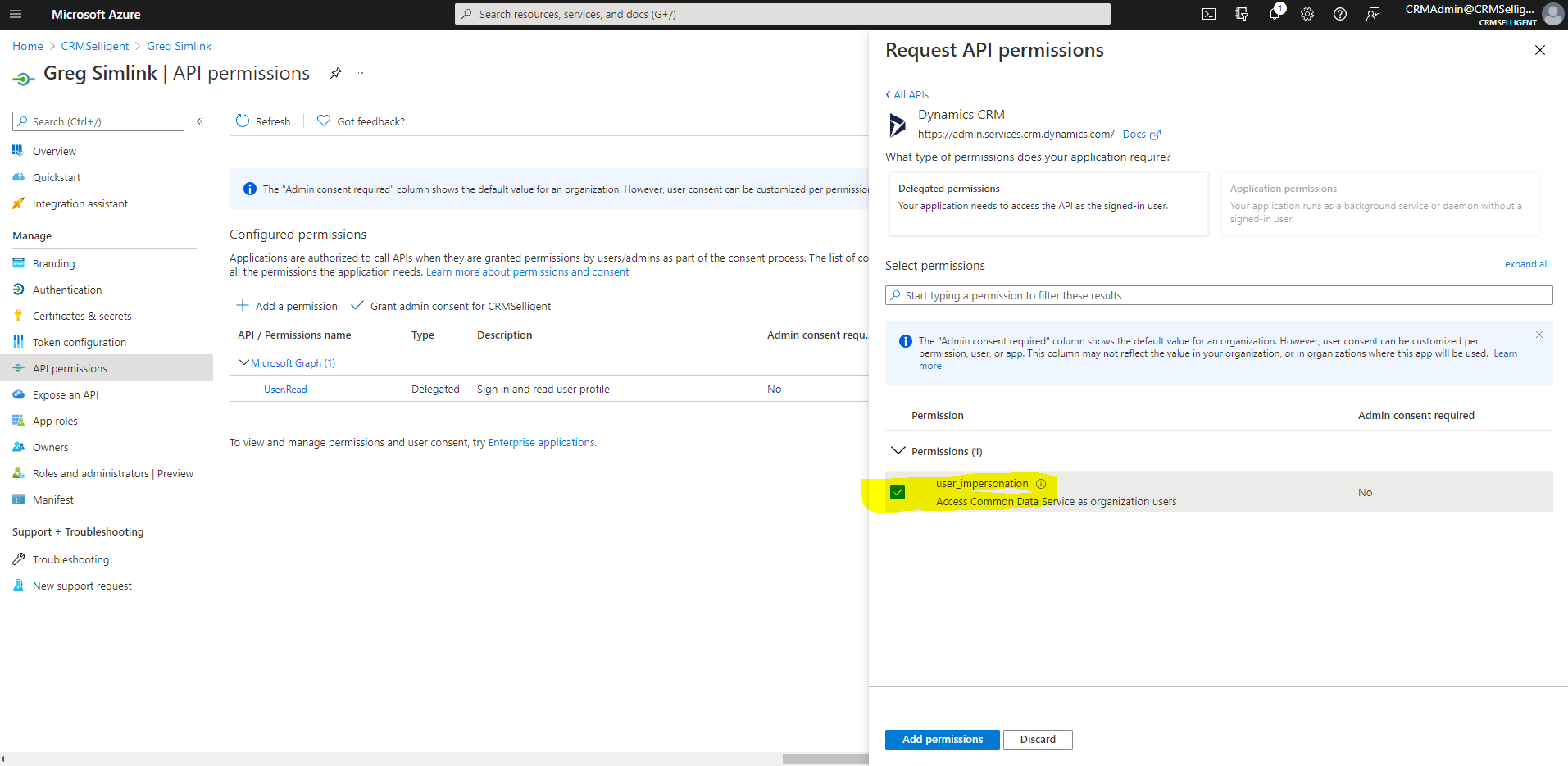 5. Go to Api permissions and click on Add a permission. Choose "Dynamics CRM" and add user_impersonation.