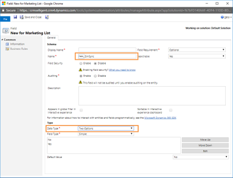 1. To be able to synchronize CRM marketing lists with Selligent, a dedicated field called Synchronize with Selligent needs to be added in the CRM environment. This field will allow to yes or no synchronize a marketing list with Selligent.