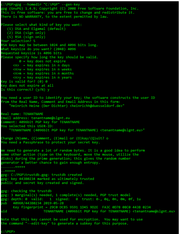 - Generate a signing key with command: gpg.exe --homedir “C:\PGP\PGPDB” --gen-key