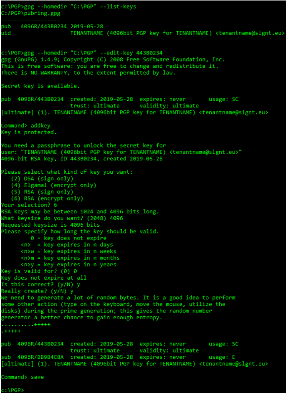 - Generate an encryption key with command: gpg.exe --homedir “C:\PGP\PGPDB” --edit-key <ID>